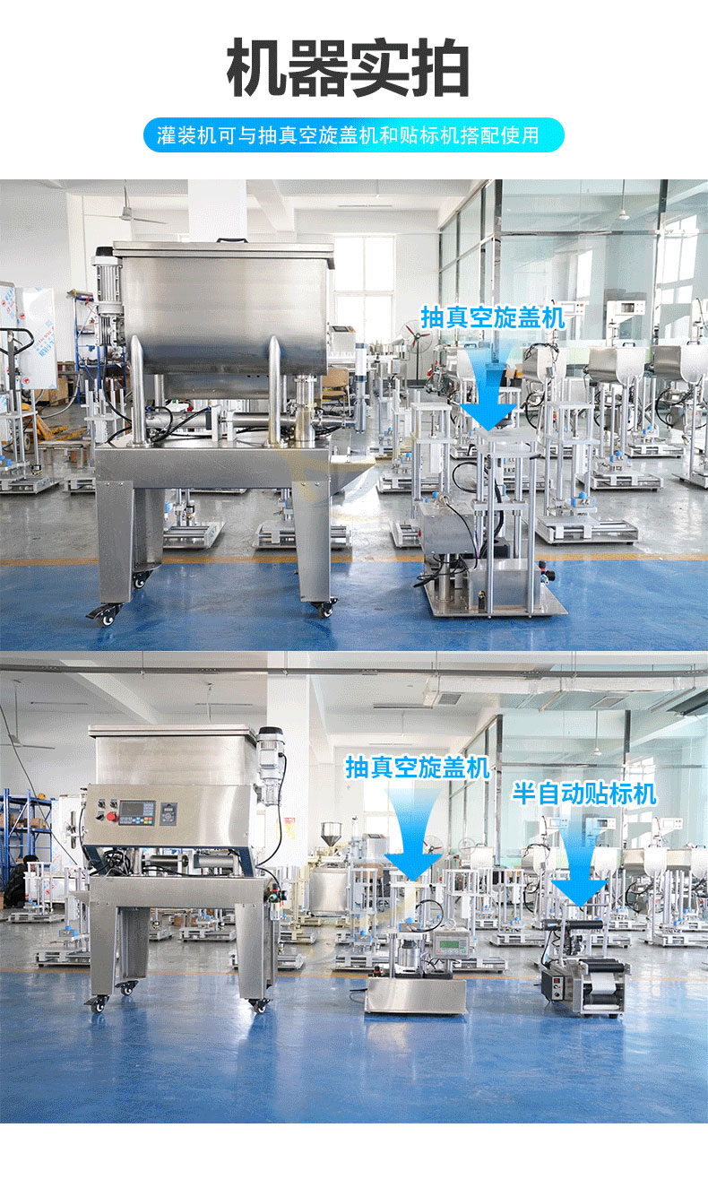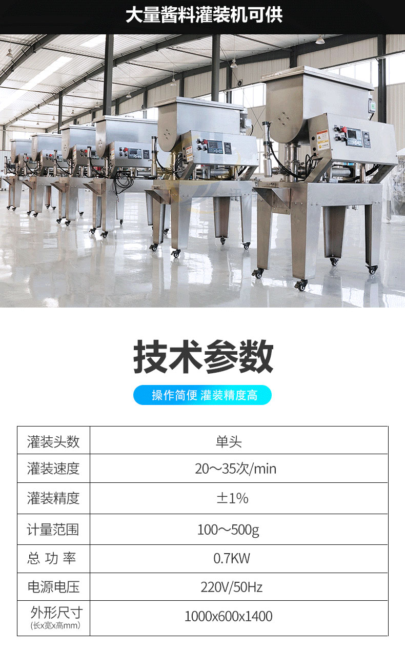 半自动酱料灌装机适用于辣椒酱、豆瓣酱、拌面酱、大块肉酱等物品的定量充填分装,适用于将各类粘稠体及含有各种固体物质