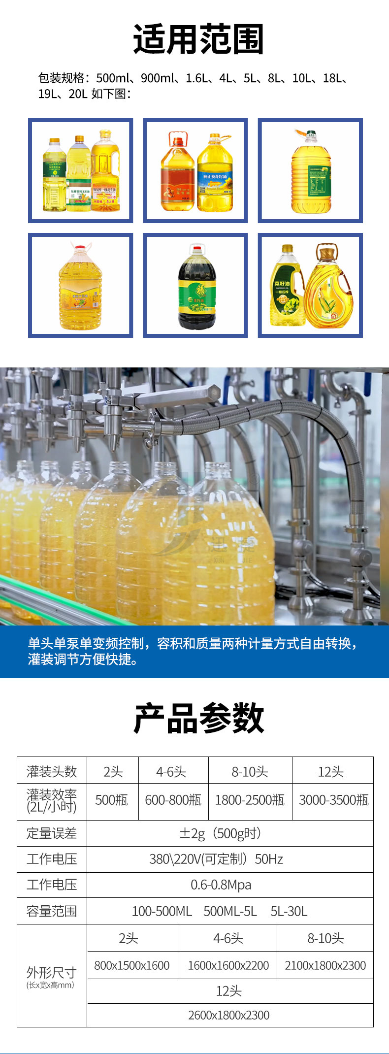 全自动八头食用油灌装机单头单泵单变频控制,容积和质量两种计量方式自由转换,灌装调节方便快捷。