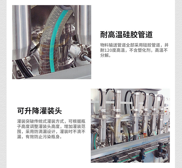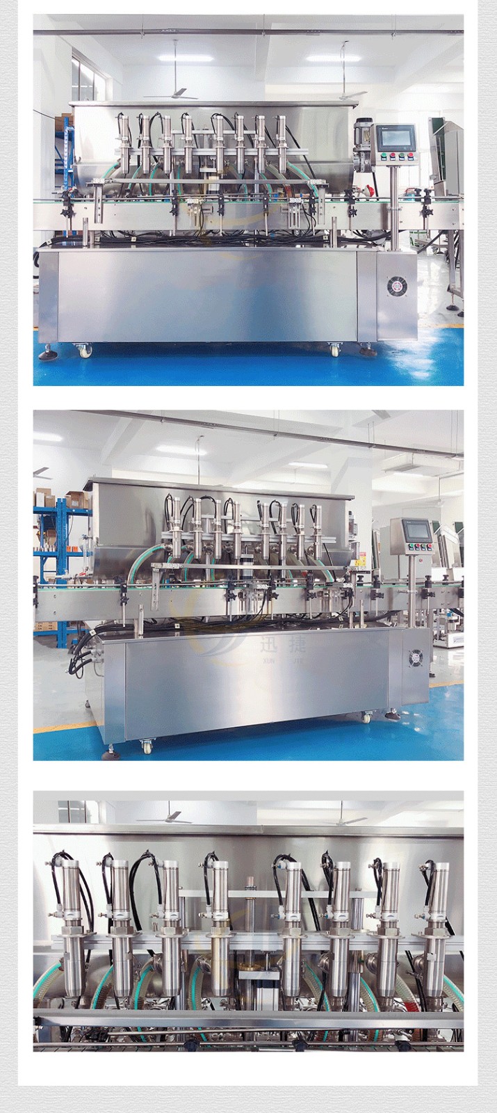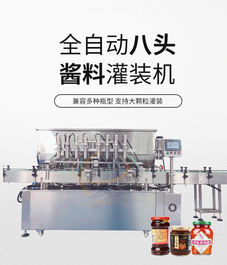 全自动八头酱料灌装机采用活塞式灌装原理,适用于调味品中带颗粒并且浓度较大的辣椒酱、豆瓣酱、花生酱、香菇酱、果酱