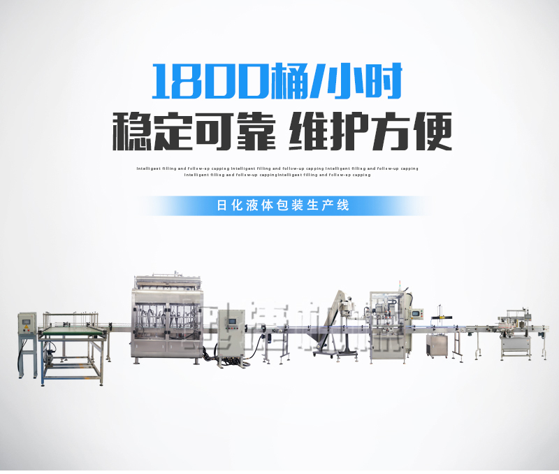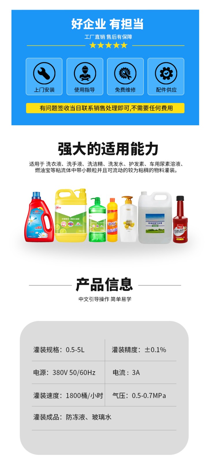 日化液体包装生产线适用于洗衣液、洗手液、洗洁精、燃油宝等粘流体中带小颗粒并且可流动的较为粘稠的物料灌装。