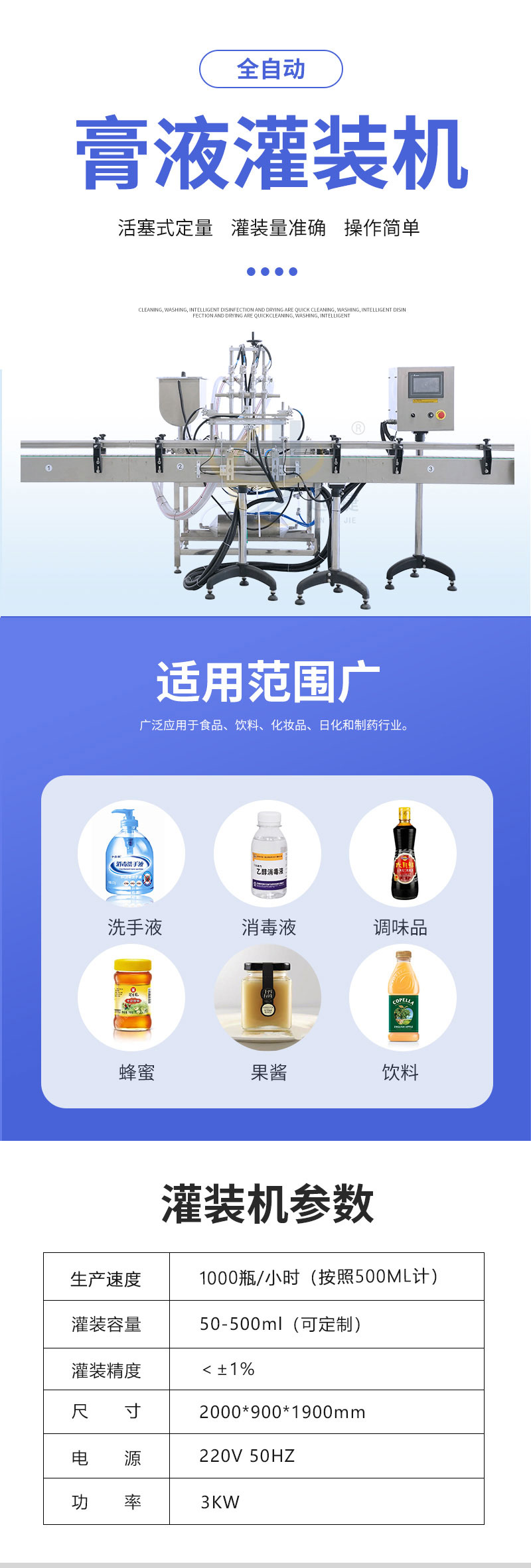全自动膏液灌装机适用于食品、饮料、化妆品、日化和制药行业。灌装头设有特殊防漏装置,灌装无拉丝,滴漏现象。