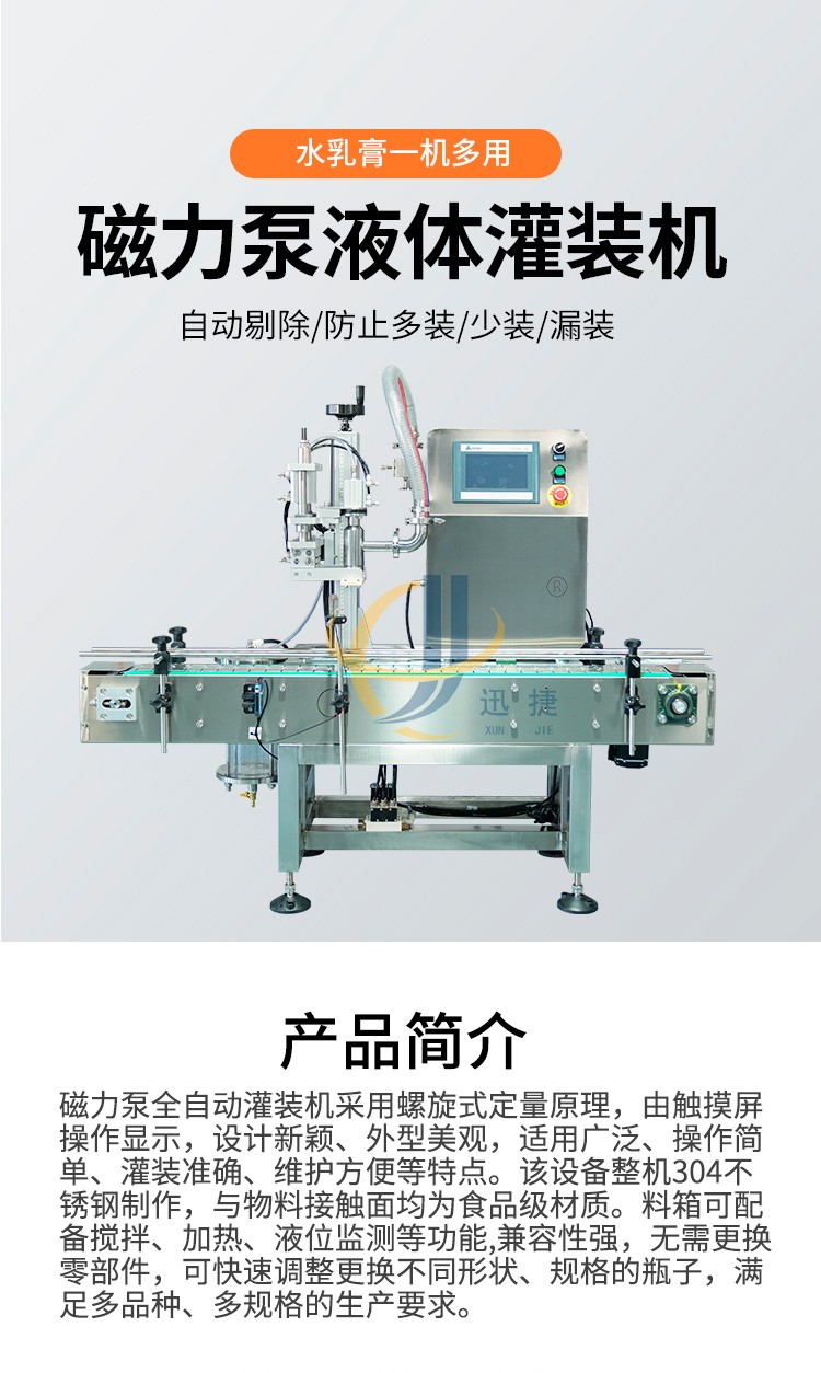 磁力泵全自动灌装机采用螺旋式定量原理,由触摸屏操作显示,设计新颖、外型美观,适用广泛、操作简