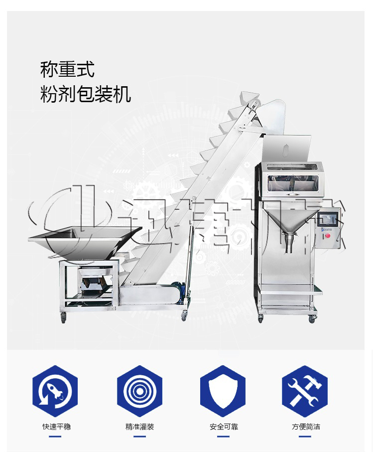 粉剂灌装包含了上料机、灌装机和封口机。一般粉剂类的产品,上料一般采用螺旋式上料,第一,能够确保原料能够供应给灌装机灌装;第二,能够减少扬尘,确保灌装环节的空气质量;第三,采用螺旋是上料,工人在向料斗加料时轻松、方便、快捷,大大提高生产效率;第四,上料机拆装方便,采用的正反转开关,可将上料机清洗干净整洁。